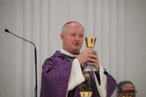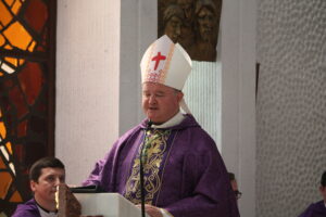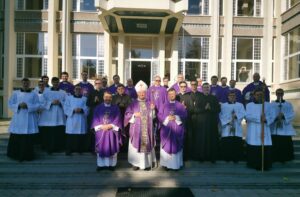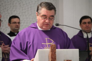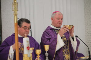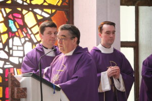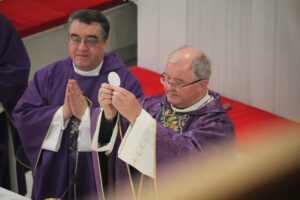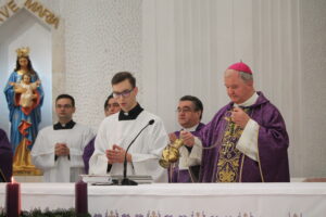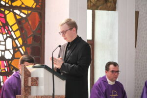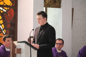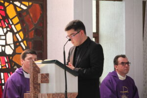 Sfânta Liturghie pontificală a fost celebrată de PS Aurel Percă. După cuvântul de invățătură, unde preasfințitul Aurel ne-a amintit importanța acestui timp al Adventului și ce presupune el, cei cinci tineri au răspuns „Prezent”, arătând astfel celor de față disponibilitatea lor față de chemarea Domnului, iar după acest moment, ajutați de nașii lor aceștia au îmbrăcat reverenda, haina preotului.